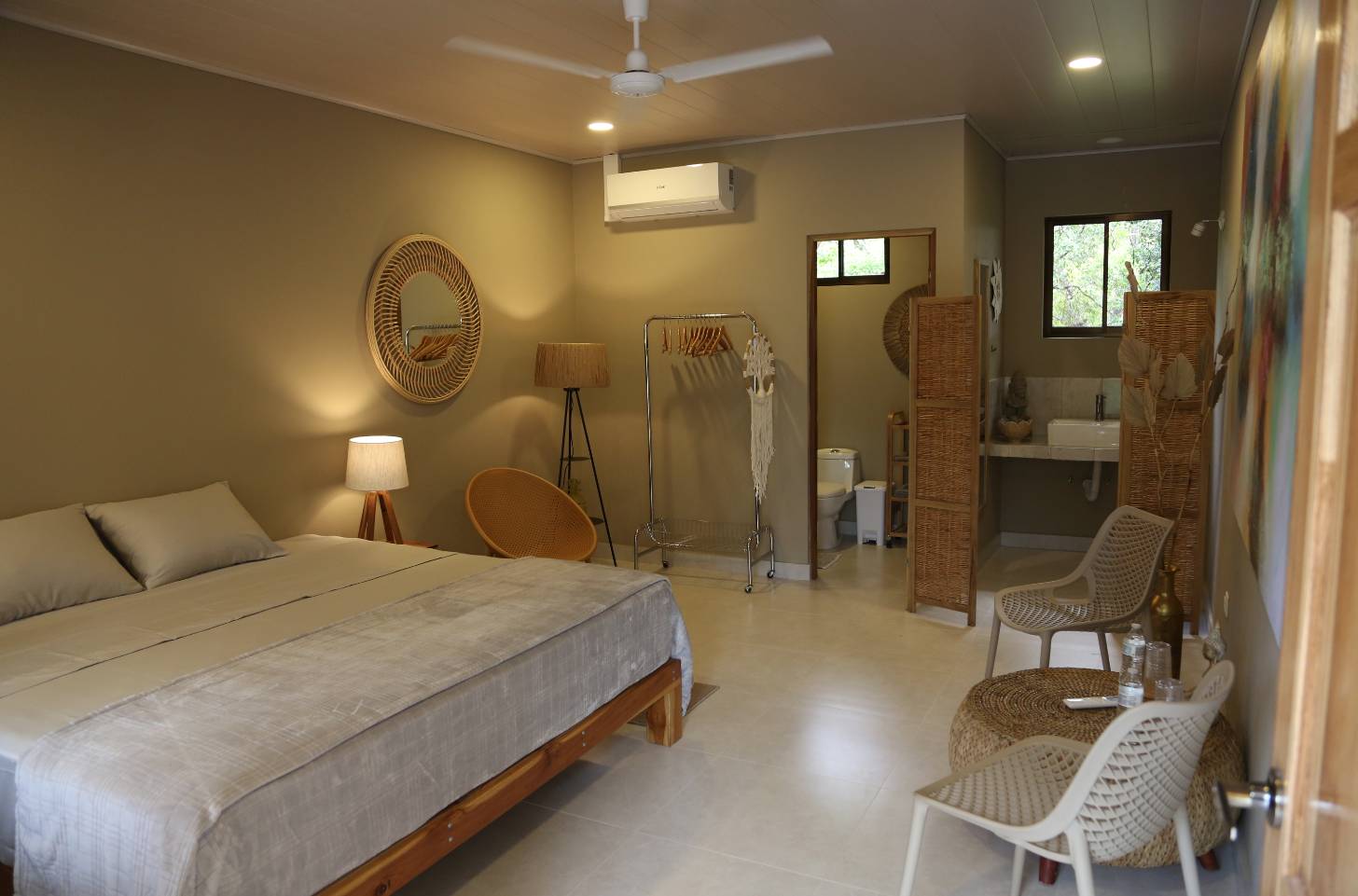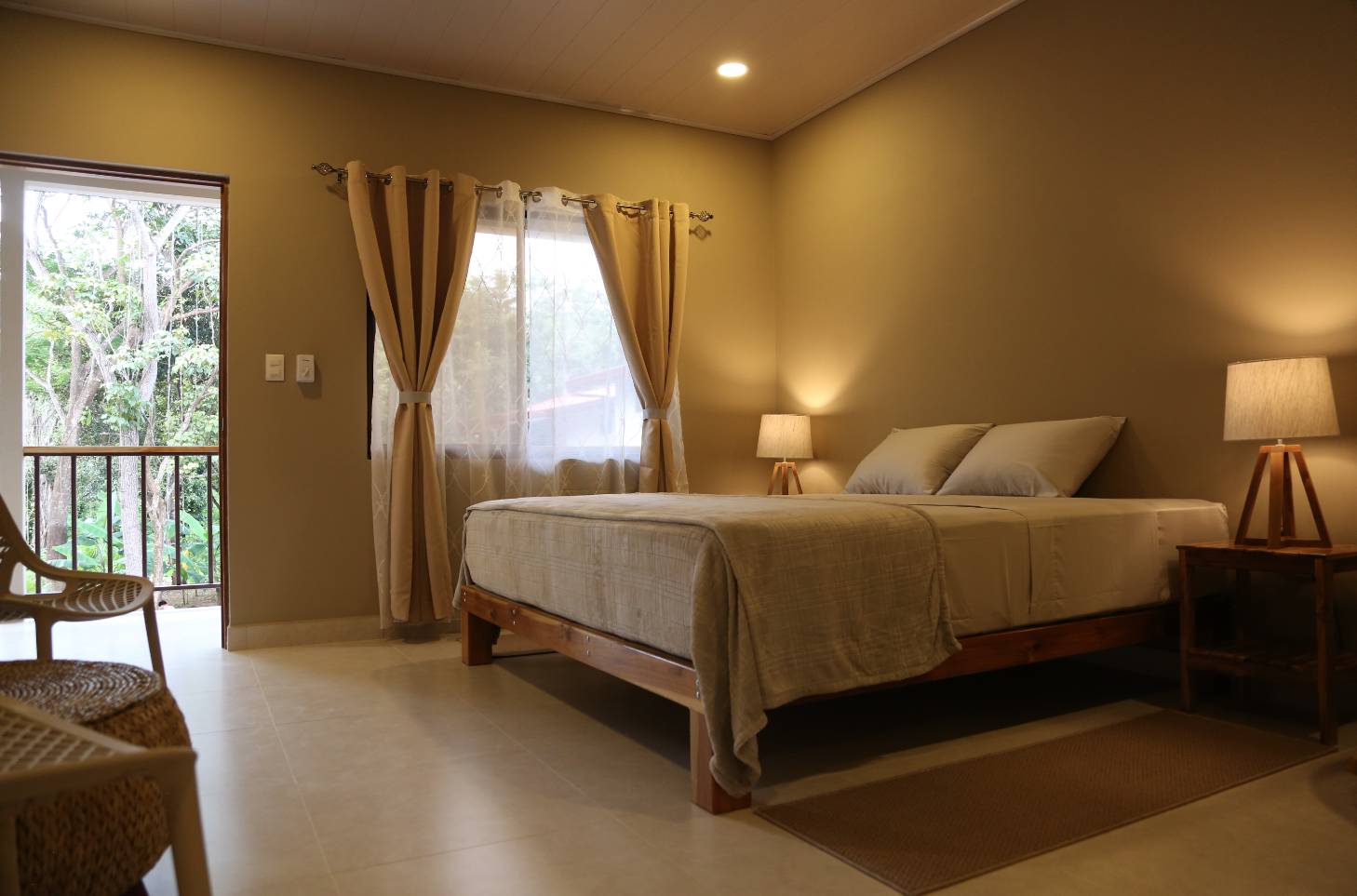 The spacious double room blends modern comfort with natural charm, featuring a king-size bed, elegant furnishings, and large windows that invite in the sights and sounds of the jungle.