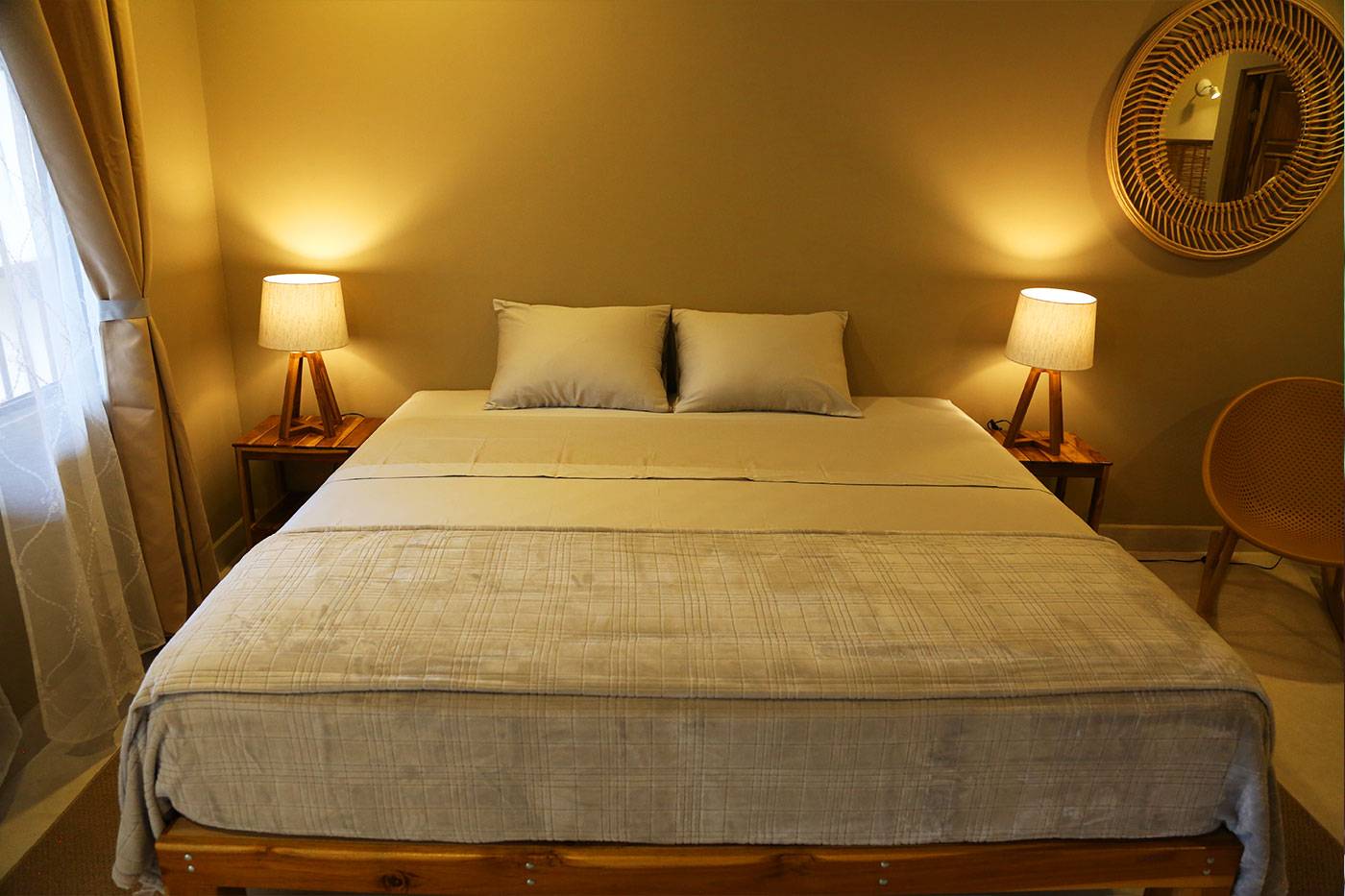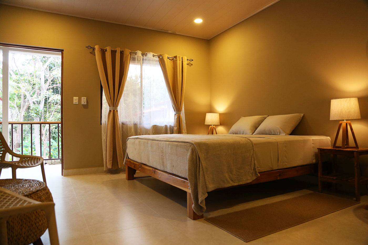 The spacious double room blends modern comfort with natural charm, featuring a king-size bed, elegant furnishings, and large windows that invite in the sights and sounds of the jungle.